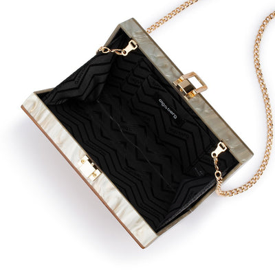 The ERIKA Acrylic Wave Bag is a beautifully crafted clutch that will add a stylish touch to your wardrobe. Crafted from acrylic with a decorative wave design, this spacious bag features three tones of colouring, with an acrylic handle for easy carrying. This natural and gold acrylic clutch is a truly timeless piece that will add a touch of luxury to your look.