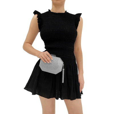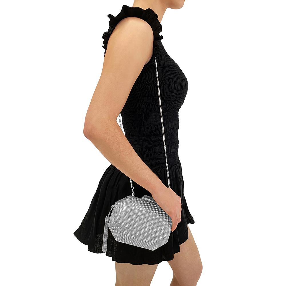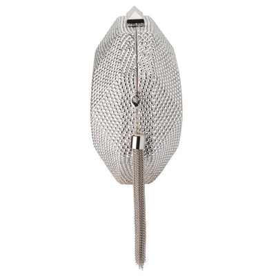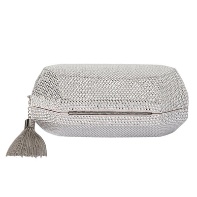The TILLY Metallic Silver Bag features hundreds of tiny metallic stones and a spacious interior making it the perfect addition to any evening look. Carry this metallic silver clutch in the palm of your hand or use the optional shoulder chain to go hands free.